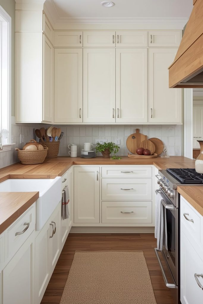 Wooden countertops with cream cabinets create a rustic yet modern vibe. I love how the warm tones of wood balance the soft neutrality of cream, providing a welcoming and practical workspace. This combination works well in both country-style kitchens and urban apartments.