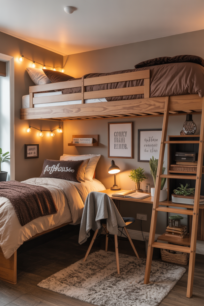A cozy lofted bed dorm room for guys can feel surprisingly inviting when inspired by coffeehouse interiors. I like layering warm-toned bedding with soft lighting and natural wood textures to create a relaxed atmosphere.