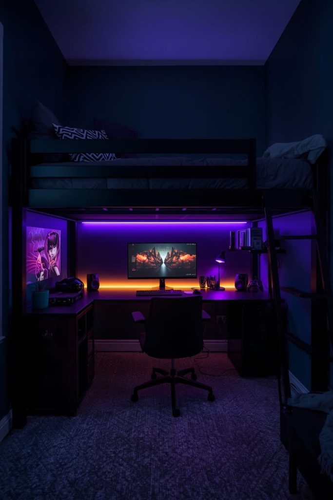 This modern lofted bed dorm room for guys feels immersive, functional, and ideal for long gaming or study sessions.