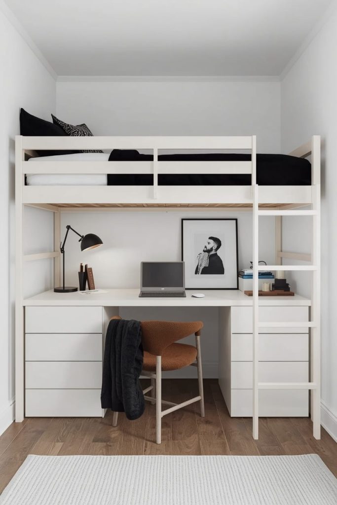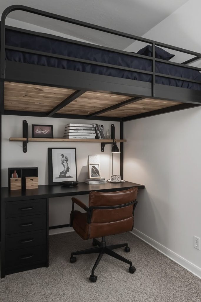 The space underneath the lofted bed becomes a functional study corner with a slim desk and leather-style chair. This lofted bed dorm room study setup for guys keeps everything organized while still looking sophisticated and masculine.