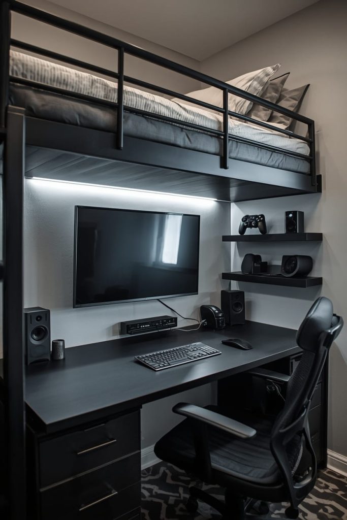 I love creating a gamer lofted bed dorm room ideas setup by combining dark tones, RGB lighting, and sleek storage solutions. A black lofted bed instantly creates a bold focal point while the area underneath becomes the perfect gaming station with a compact desk and mounted monitor.