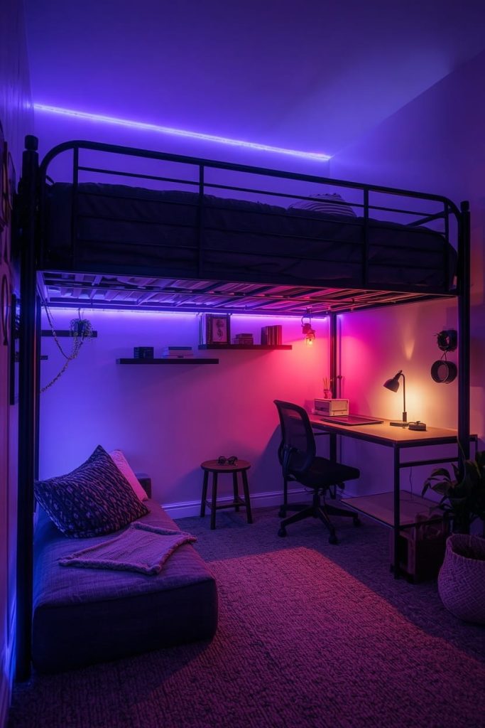A lofted bed dorm room with LED lights can completely change the atmosphere of a small dorm. I like placing color-changing strips around the loft frame and under the desk area to create a relaxing nighttime glow.