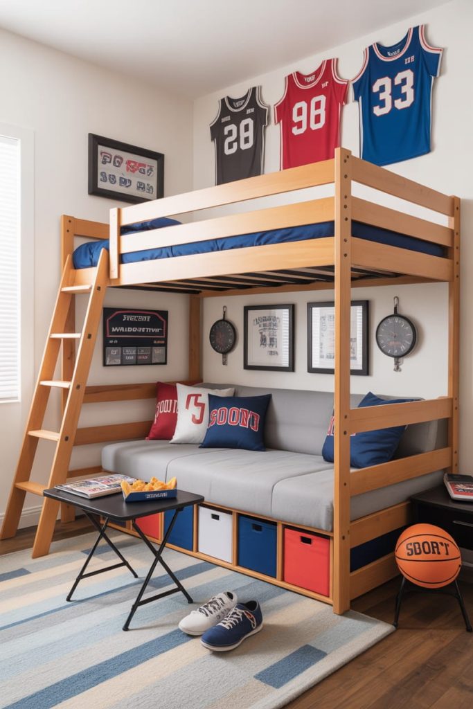 A lofted twin bed dorm room for guys can feel like a mini sports lounge when designed around favorite teams and athletic décor. I love placing a compact futon underneath the lofted bed while adding framed jerseys and sports-inspired wall prints nearby.
