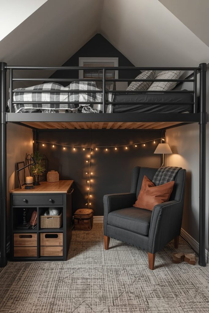 A black and gray lofted dorm room ideas setup can feel warm and rustic when mixed with cabin-inspired textures. I like combining plaid bedding, wood tones, and warm string lights to soften the industrial feel of standard dorm furniture.