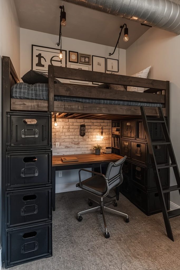 A masculine lofted bed dorm room ideas setup looks incredible when mixed with industrial-inspired textures. I like using metal storage crates, dark wood accents, and exposed-style lighting to create a loft apartment vibe inside a small dorm room.